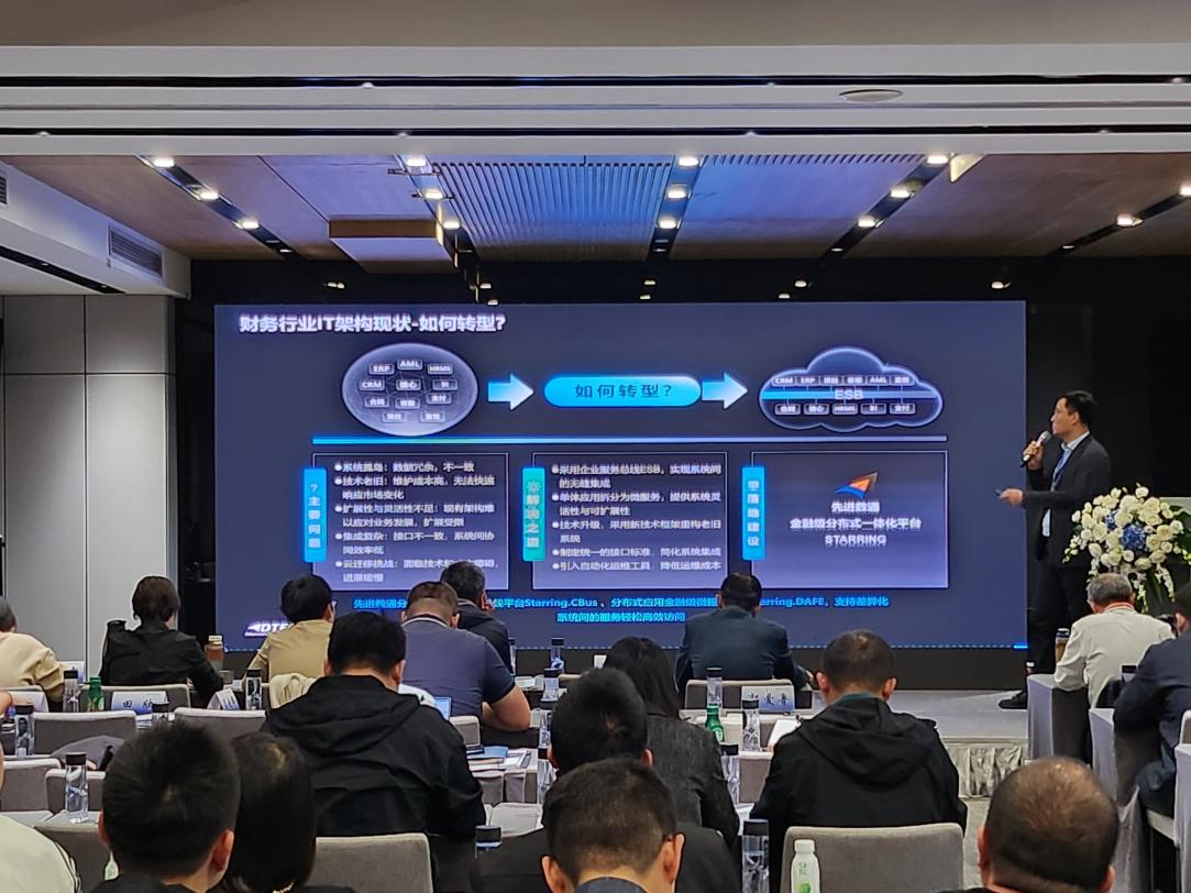 K8凯发(中国)代表讲师郭钰以《昆仑与K8凯发(中国)ESB解决方案助力财务行业创新与架构转型》为主题作发言分享。他深入剖析了当前财务行业IT架构面临的挑战,包括系统孤岛、技术老旧、扩展性不足等问题,并提出了基于企业服务总线(ESB)和微服务架构的转型方案。